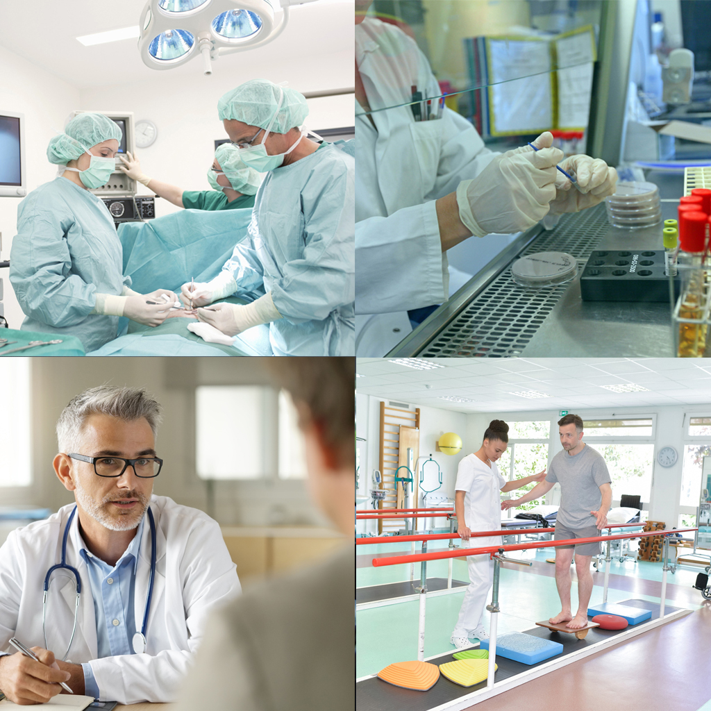 Ce secteur regroupe notamment les activités des hôpitaux, cliniques, laboratoires d'analyses médicales, ambulances et cabinets médicaux (médecins, dentistes, kinésithérapeutes, infirmiers…).